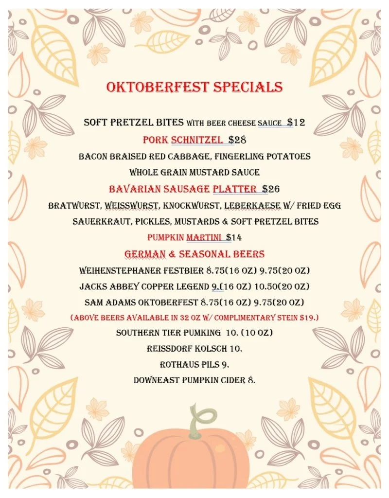 We'll have traditional German dishes and imported beers on draft, as well as a few pumpkin flavored delights! π